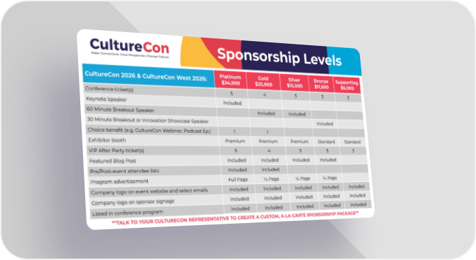 CultureCon 2026 & CultureCon West 2026: Platinum $34,900 Gold $25,900 Silver $15,500 Bronze $11,500 Supporting $5,000 Conference ticket(s) 5 4 3 3 3 Keynote Speaker Included 60 Minute Breakout Speaker Included Included 30 Minute Breakout or Innovation Showcase Speaker Included Choice benefit (e.g. CultureCon Webinar, Podcast Ep.) 1 1 Exhibitor booth Premium Premium Premium Standard Standard VIP After Party ticket(s) 5 4 3 3 3 Featured Blog Post Included Included Included Included Pre/Post-event attendee lists Included Included Program advertisement Full Page Page Page Page Company logo on event website and select emails Included Included Included Included Included Company logo on sponsor signage Included Included Included Included Included Listed in conference program Included Included Included Included Included Sponsorship Levels **TALK TO YOUR CULTURECON REPRESENTATIVE TO CREATE A CUSTOM, A-LA-CARTE SPONSORSHIP PACKAGE**