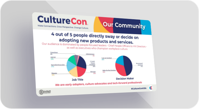 Our Community 4 out of 5 people directly sway or decide on adopting new products and services. Our audience is dominated by people-focused leaders - Chief People Officers to HR Directors - as well as executives who champion workplace culture. We are early adopters, culture advocates and tech-forward professionals