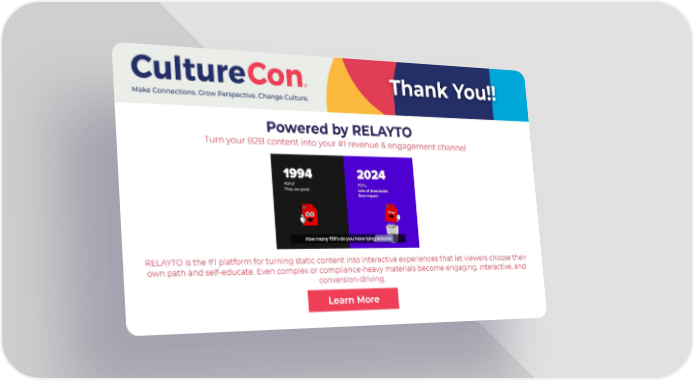 Thank You!! Powered by RELAYTO Turn your B2B content into your #1 revenue & engagement channel RELAYTO is the #1 platform for turning static content into interactive experiences that let viewers choose their own path and self-educate. Even complex or compliance-heavy materials become engaging, interactive, and conversion-driving. Learn More