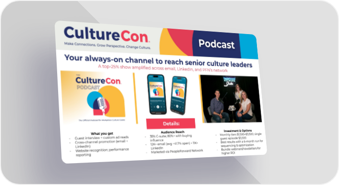 Podcast Your always-on channel to reach senior culture leaders A top-25% show amplified across email, LinkedIn, and PFNs network What you get - Guest interview + custom ad reads - Cross-channel promotion (email + LinkedIn) - Website recognition; performance reporting Audience Reach - 35% C-suite; 80%+ with buying influence - 12K+ email (avg ~41.7% open) + 11K+ LinkedIn - Marketed via PeopleForward Network Investment & Options - Monthly tiers $1,500$3,500; single guest episode $3,500 - Best results with a 6-month run for sequencing & optimization - Bundle webinars/newsletters for higher ROI Details: