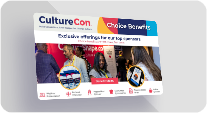 Choice Benefits Exclusive offerings for our top sponsors Choice benefits are first come, first serve Benefit Ideas: Webinar Presentation Podcast Interview Happy Hour Sponsor Event Meal Sponsorship Targeted Seat Drop Coffee Sponsor