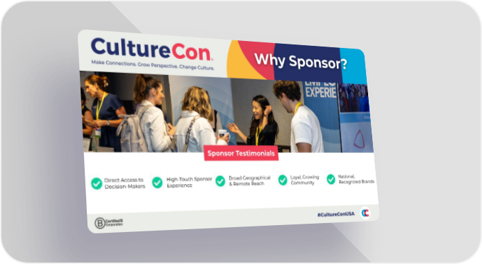 CultureCon 2026 Partnerships Page 9 Page 11Why Sponsor? Sponsor Testimonials Direct Access to Decision-Makers High-Touch Sponsor Experience Broad Geographical & Remote Reach Loyal, Growing Community National, Recognized Brands