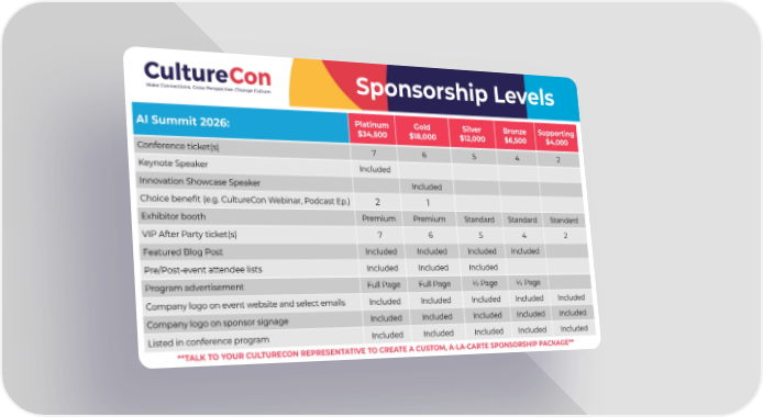AI Summit 2026: Platinum $34,500 Gold $18,000 Silver $12,000 Bronze $6,500 Supporting $4,000 Conference ticket(s) 7 6 5 4 2 Keynote Speaker Included Innovation Showcase Speaker Included Choice benefit (e.g. CultureCon Webinar, Podcast Ep.) 2 1 Exhibitor booth Premium Premium Standard Standard Standard VIP After Party ticket(s) 7 6 5 4 2 Featured Blog Post Included Included Included Included Pre/Post-event attendee lists Included Included Included Program advertisement Full Page Full Page Page Page Company logo on event website and select emails Included Included Included Included Included Company logo on sponsor signage Included Included Included Included Included Listed in conference program Included Included Included Included Included Sponsorship Levels **TALK TO YOUR CULTURECON REPRESENTATIVE TO CREATE A CUSTOM, A-LA-CARTE SPONSORSHIP PACKAGE**