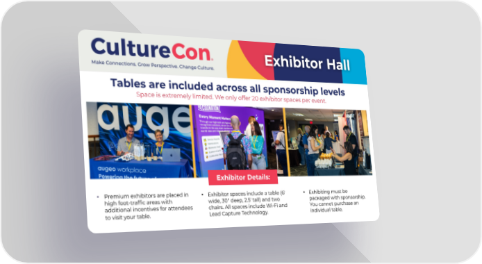 Exhibitor Hall Tables are included across all sponsorship levels Space is extremely limited. We only offer 20 exhibitor spaces per event. Premium exhibitors are placed in high foot-traffic areas with additional incentives for attendees to visit your table . Exhibitor spaces include a table (6' wide, 30" deep, 2.5' tall) and two chairs. All spaces include Wi-Fi and Lead Capture Technology. Exhibiting must be packaged with sponsorship. You cannot purchase an individual table. Exhibitor Details: